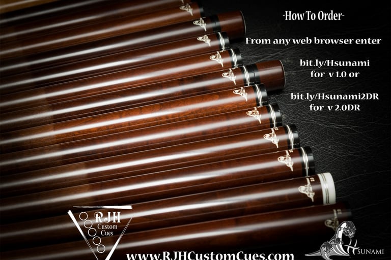 Handmade cues tailored to your style, featuring the famous Hsunami shaft.